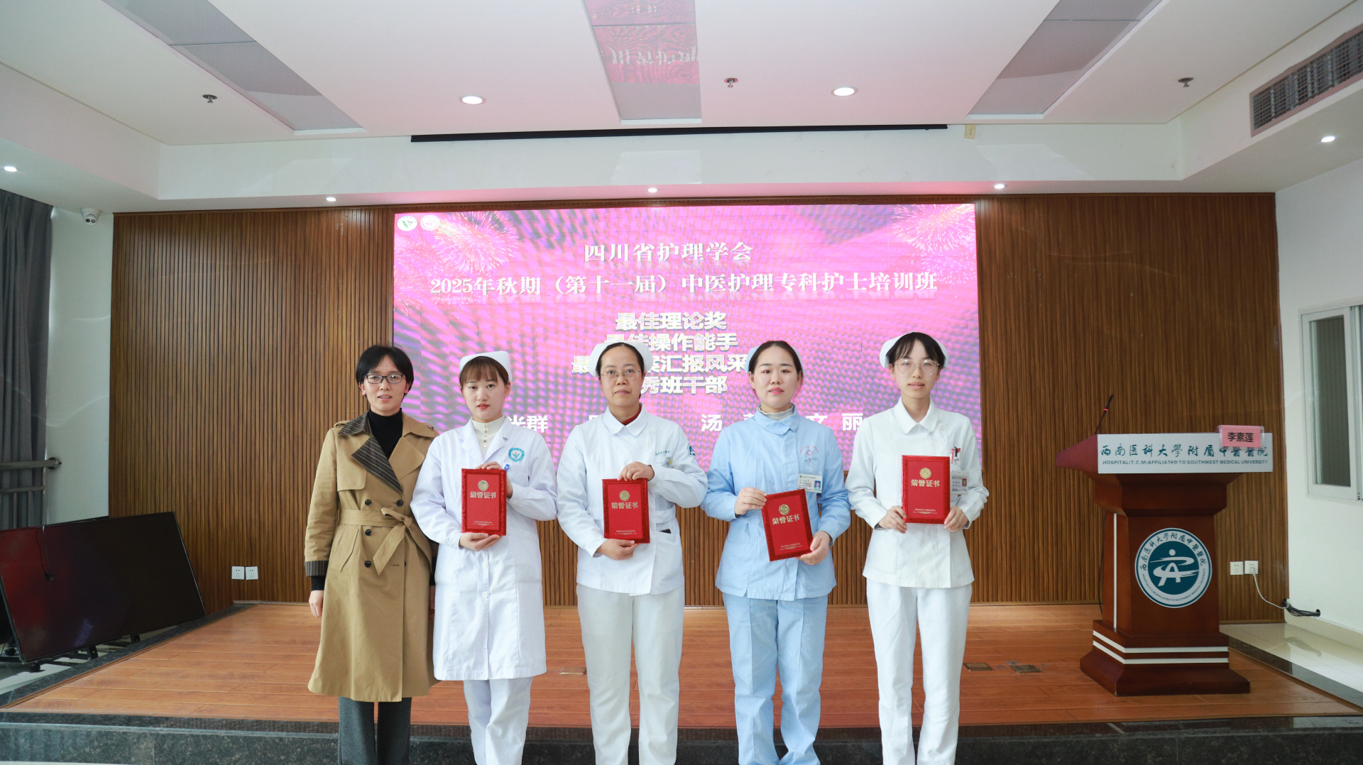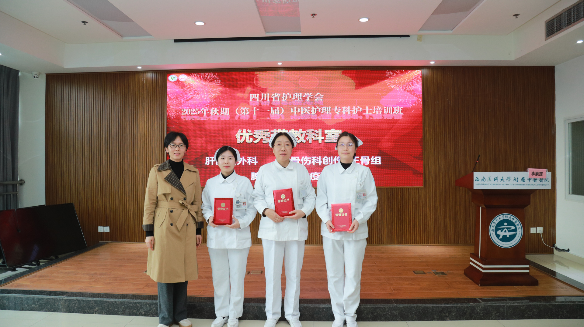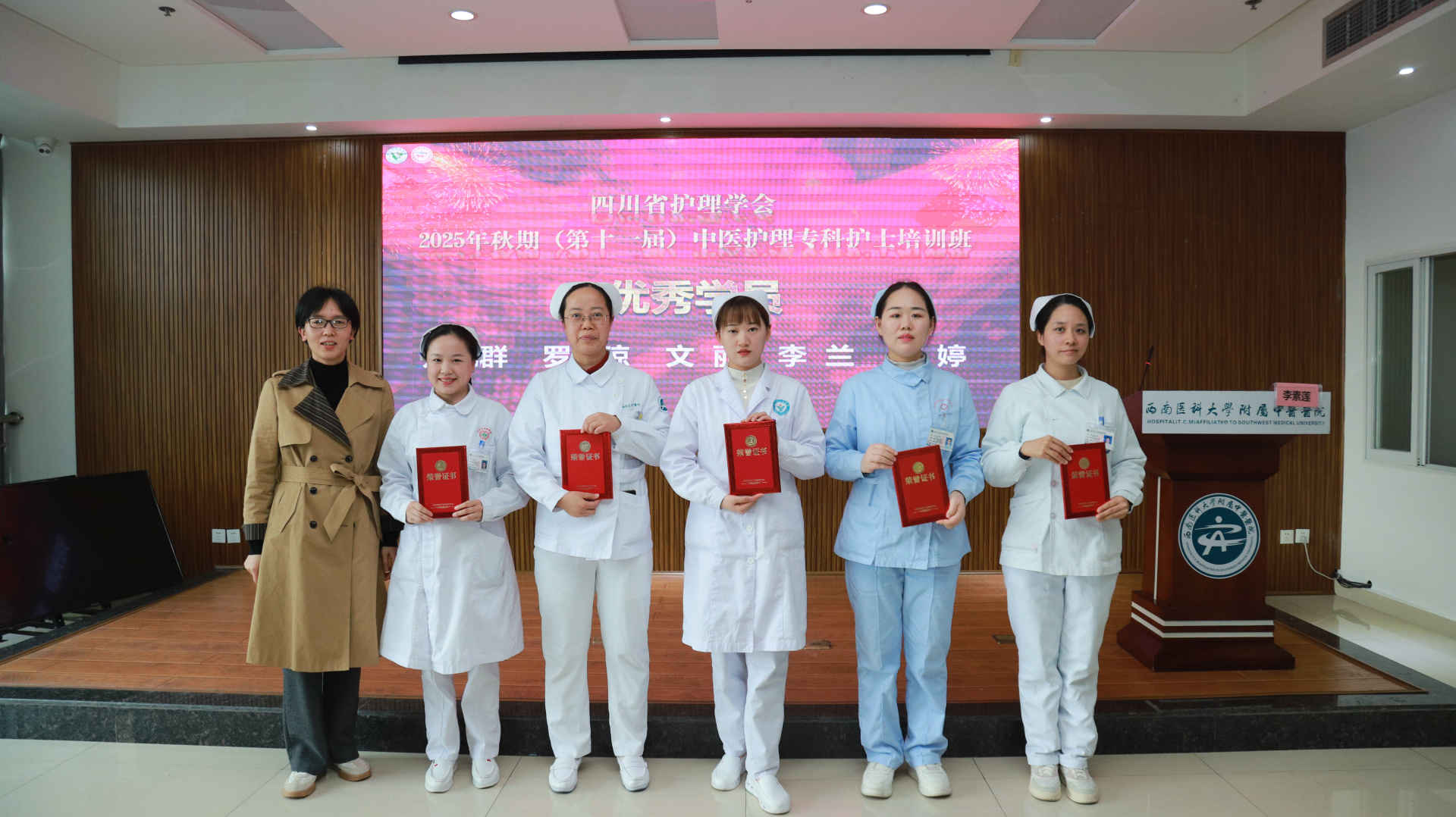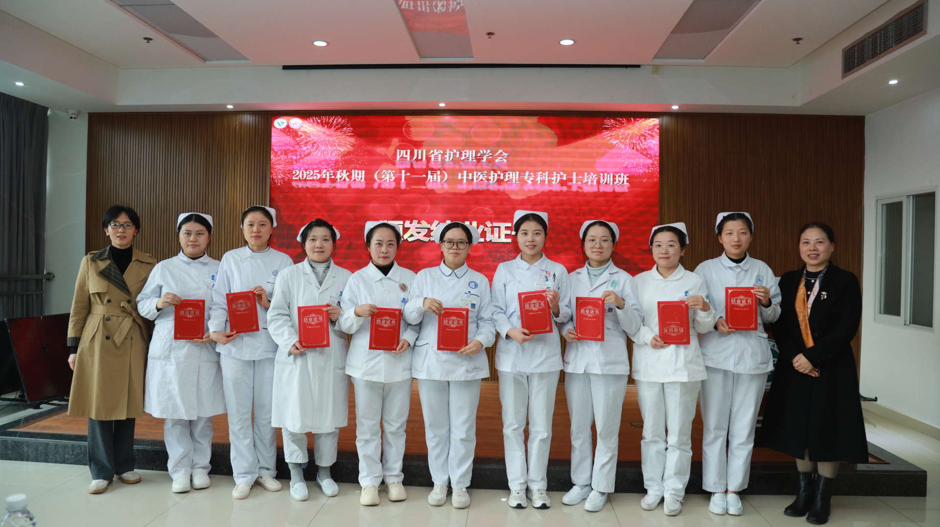 11月28日,我院举行四川省护理学会2025年秋期(第十一届)中医护理专科护士培训班结业仪式。医院院长汪国友,副院长董丽,基地负责人、相关职能部门负责人、基地科室护士长及带教老师、本届全体学员参加仪式。仪式由护理部部长李素莲主持。