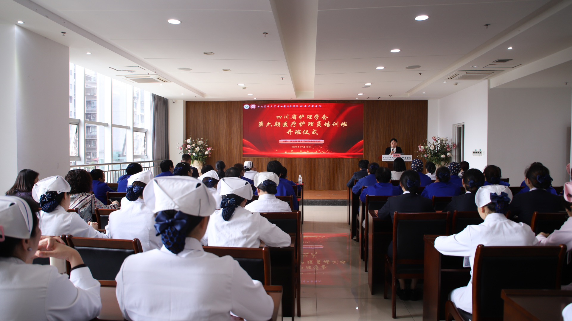 4月8日,我院举行第六期医疗护理员培训班开班仪式。医院副院长董丽,护理部全体人员、基地科室护士长及23名医疗护理员学员参加仪式。仪式由护理部部长李素莲主持。