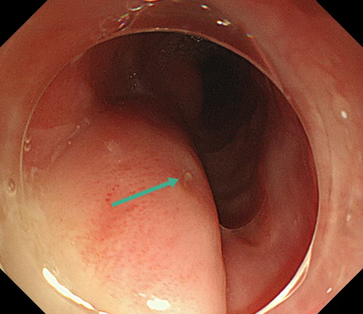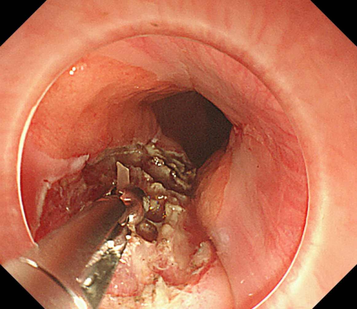 随着胃镜插入食管,刘蔚在患者食管入口处查见一脓肿,顶端有一开口样凹陷。轻轻按压,竟有脓液从一个细小的破口处不断冒出,结合CT报告和患者卡刺一周的病史,刘蔚立刻判断:这根鱼刺不是常规横卡在食管腔,应是由此处刺破了食管黏膜,钻进了食管壁的夹层中,在里面“潜伏”了整整一周,持续刺激食管壁,引发了严重的感染化脓,形成了脓肿。