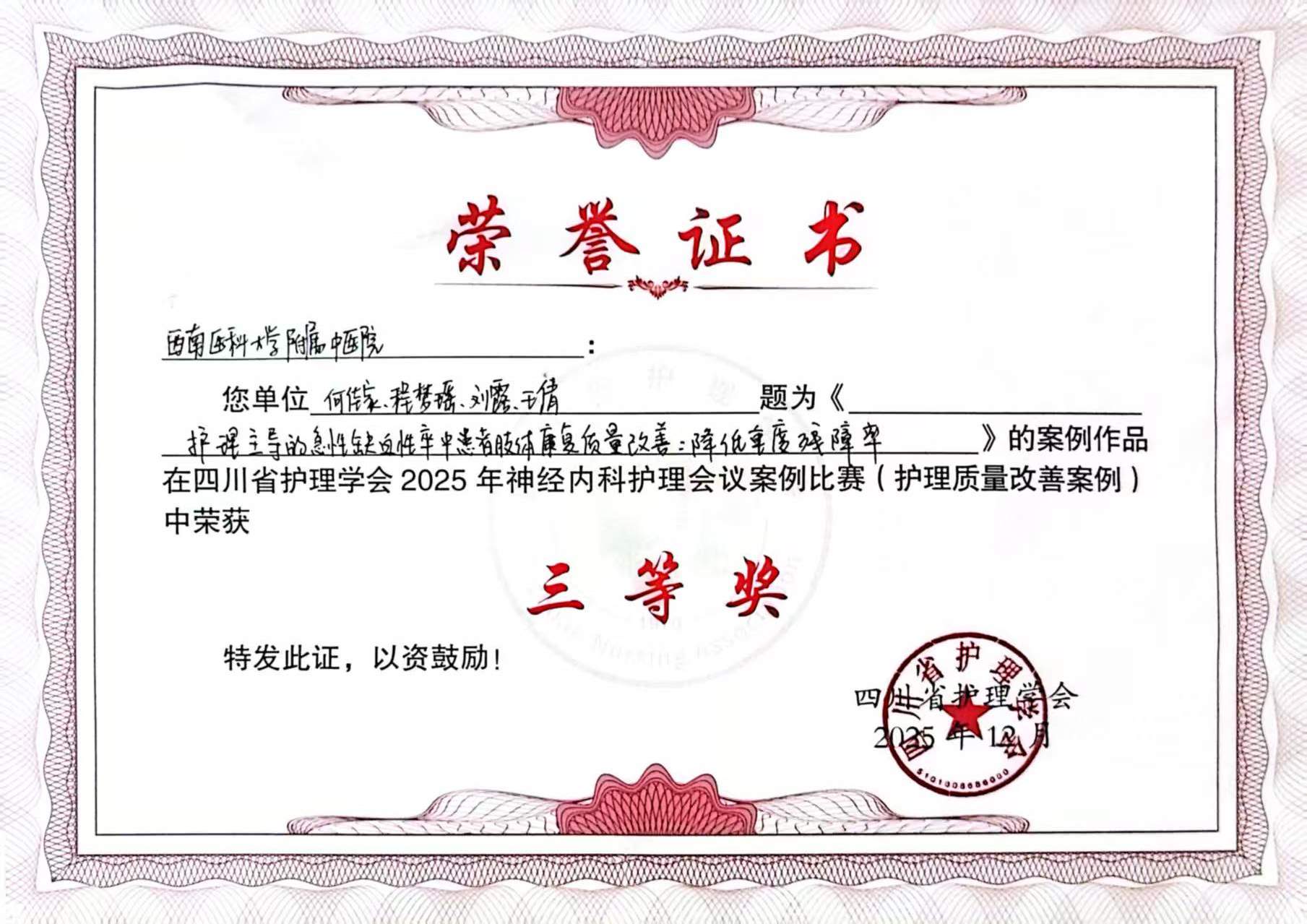 12月14日,四川省护理学会2025年神经内科护理会议案例比赛在成都举行,全省各医疗机构共64个案例参赛。经过激烈角逐,12个案例入围决赛进行了现场汇报,其中我院神经内科护理团队汇报的案例《护理主导的急性缺血性卒中患者肢体康复质量改善:降低重度残障率》荣获三等奖。