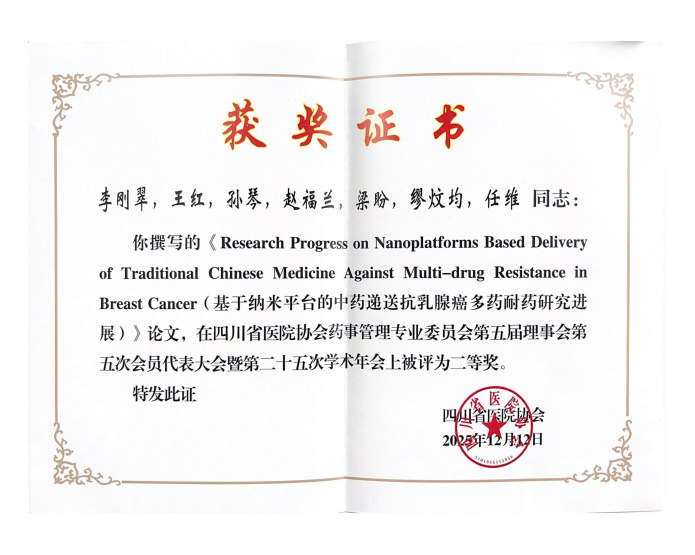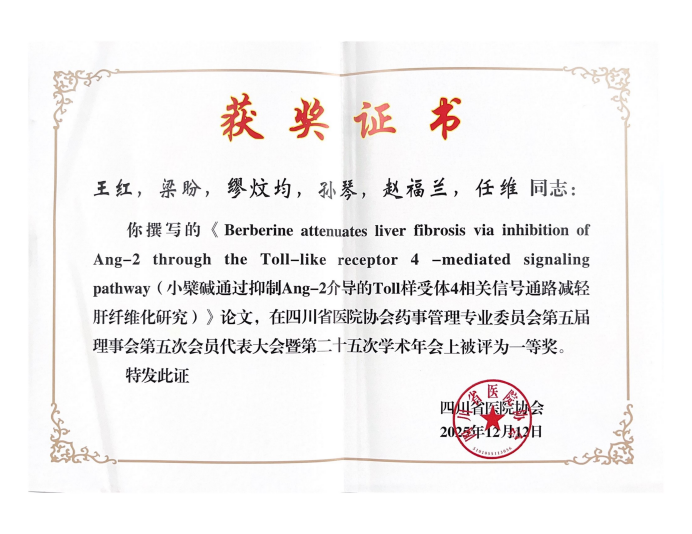 由我院中西医结合研究中心任维副研究员指导,研究生王红、李刚翠撰写的科研论文《Berberine attenuates liver fibrosis via inhibition of Ang-2 through the Toll-like receptor 4 -mediated signaling pathway》《Research Progress on Nanoplatforms Based Delivery of Traditional Chinese Medicine Against Multi-drug Resistance in Breast Cancer》分别荣获一等奖与二等奖;静脉用药调配中心李浓的科研论文《选择素网络重构:AI赋能的动脉粥样硬化精准干预新策略与转化药学研究》荣获三等奖。