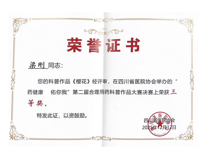 此外,在大会同期举办的“药健康 佑你我”第二届合理用药科普作品大赛决赛上,我院药剂科副主任梁刚创作的科普作品《樱花》荣获三等奖。